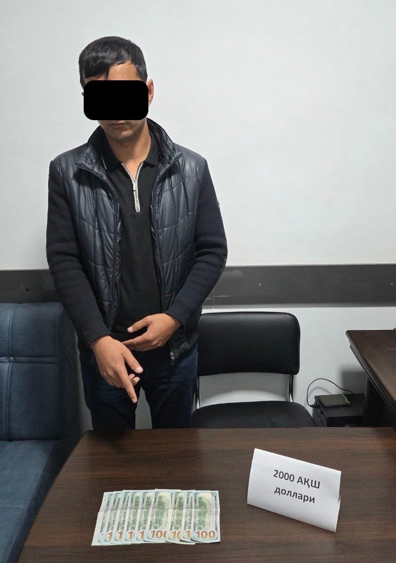 Kadastr agentligining Qarshi tuman bo‘limi yetakchi inspektori o‘zining mansabdor tanishlari orqali 2000 y.t. fuqaro tomonidan noqonuniy egallab olingan 12 sotix yer maydoni uchun qo‘llanilgan 82 mln so‘m jarimani bartaraf qilib berish va mazkur yer uchastkasining kadastr hujjatlarini tayyorlab berish evaziga 2 ming AQSH dollari olgan vaqtida ashyoviy dalillar bilan ushlandi.